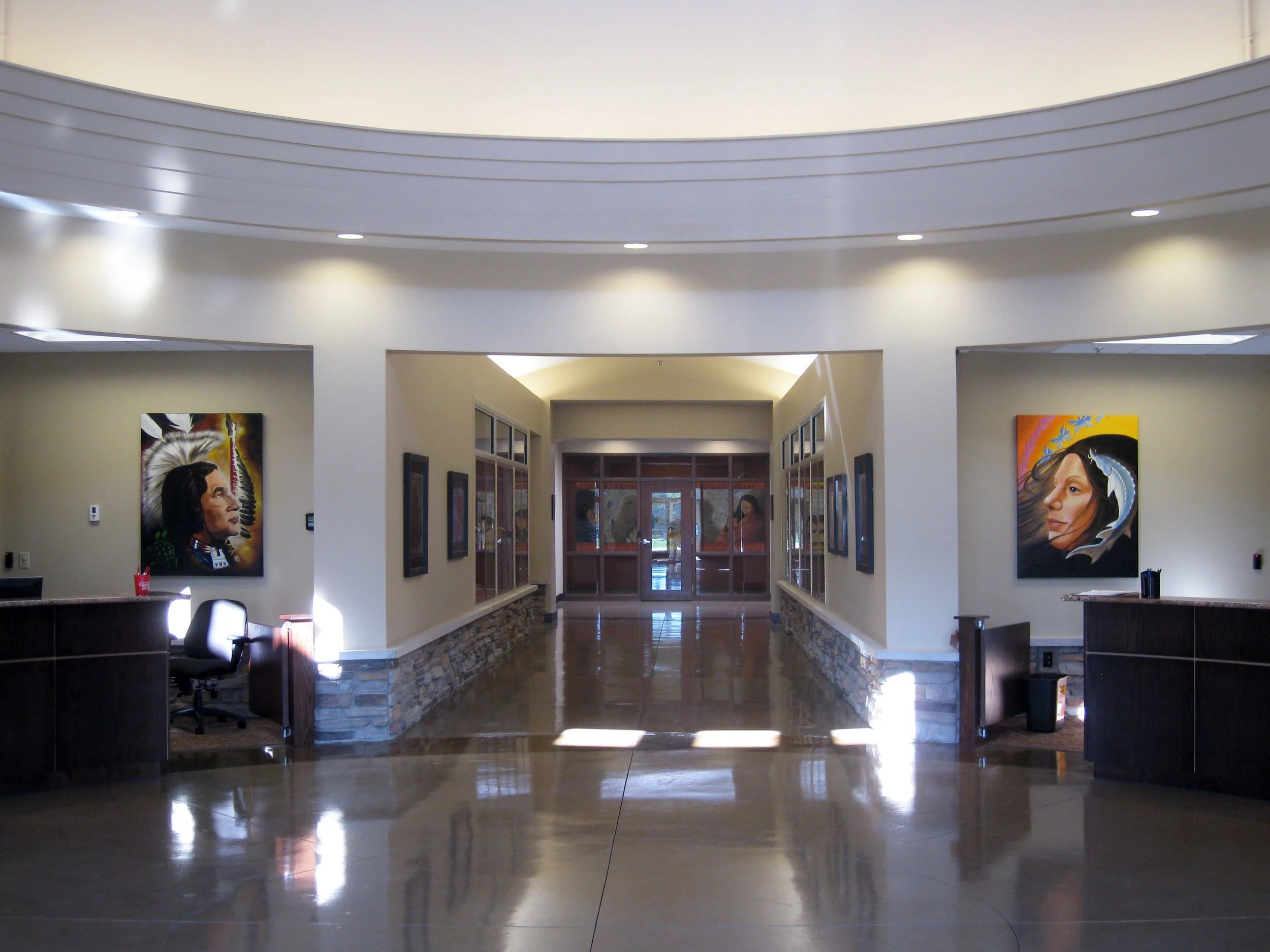 The use of bright colors, symbolic and sustainable design features added to the character of this 19,100 square foot Administration Building for the Pokagon Band of the Potawatomi Indian Tribe. The project included using sustainable practices, closed loop geothermal HVAC, cement board siding, native plantings and other energy saving electrical lighting controls and fixtures.
